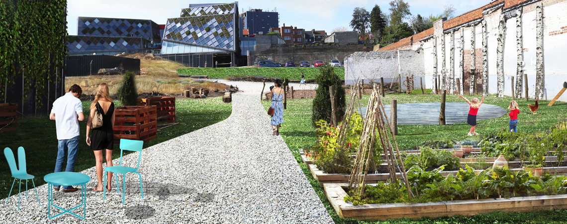 Autour de ces containers et d’une rampe permettant le cheminement depuis l’esplanade de l’Hôtel de Ville, l’artiste Werner Moron, "sculpteur de biotopes", a conçu un grand parc paysager en 8 zones favorisant la biodiversité, où ont été plantées des essences différentes : milieu humide ou sec, petite mare, milieu ombragé ou ensoleillé, sols pauvres et riches. Un peu partout, des grands bancs de pierre ou de bois inciteront au repos et à l’échange. Une pépinière slow prendra ses quartiers sur le site afin d’aider les visiteurs à redécouvrir les plantes indigènes et à recréer chez eux des espaces verts qui vivent et qui participent à la création de couloirs de biodiversité dans la ville.