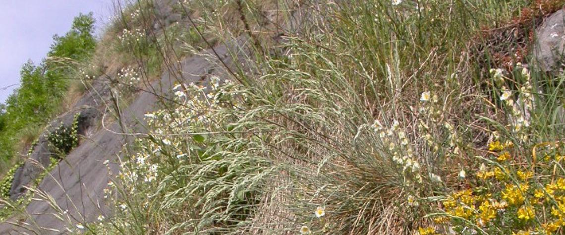 Là où une végétation rase a su s’ancrer, elle étonne par sa singularité. Hélianthème des Apennins, hippocrépide en ombelle, fétuque des rochers, laitue vivace : ces quelques espèces méridionales se trouvent ici à leur limite de progression vers le nord. Des arbustes à l’écorce sombre et aux branches tourmentées se développent un peu partout, y compris sur les versants les plus pentus. Il s’agit du bois de Sainte-Lucie, appelé aussi faux merisier.