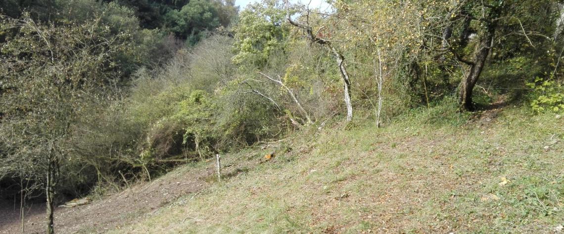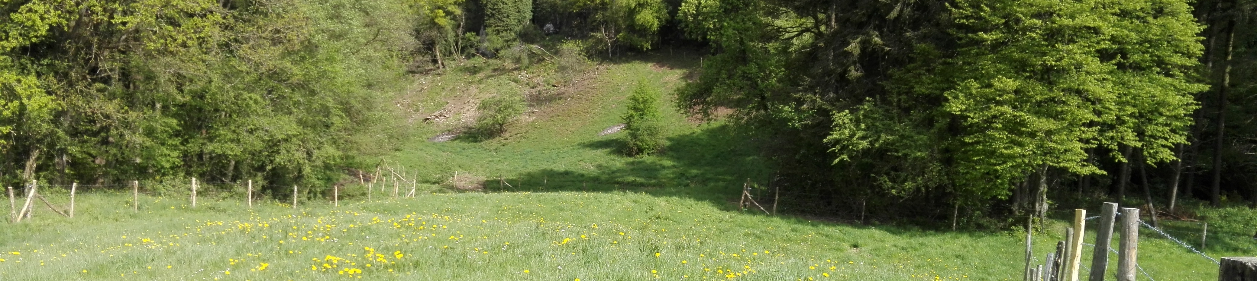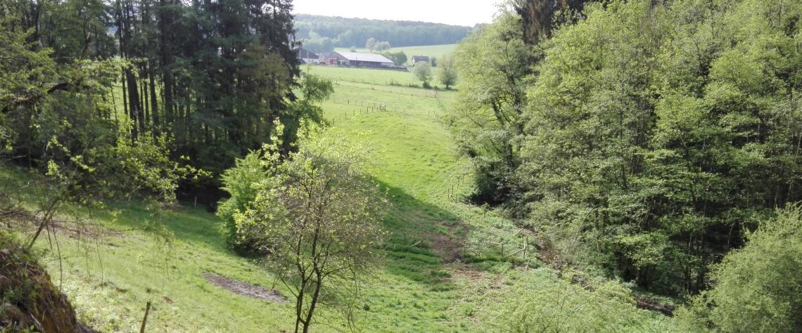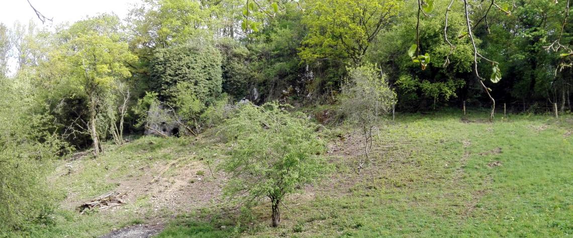 À peine a-t-on quitté le bord du ruisseau que s’étend un petit coteau escarpé où l’on rencontre un cortège fleuri des plus méditerranéens (origan, scabieuse). Le talus mène à des entrées de grotte. On raconte même qu’un ensemble de galeries parcourraient le sous-sol du village pour rejoindre les fameuses grottes de Hotton, quelques deux kilomètres plus loin ! Au sommet des grottes, une prairie maigre de fauche entoure un très beau bois calcaire, avec une flore vraiment typique et quelques espèces prestigieuses (céphalanthères, orchis mâle, actée, bois-joli ou laurier des bois).